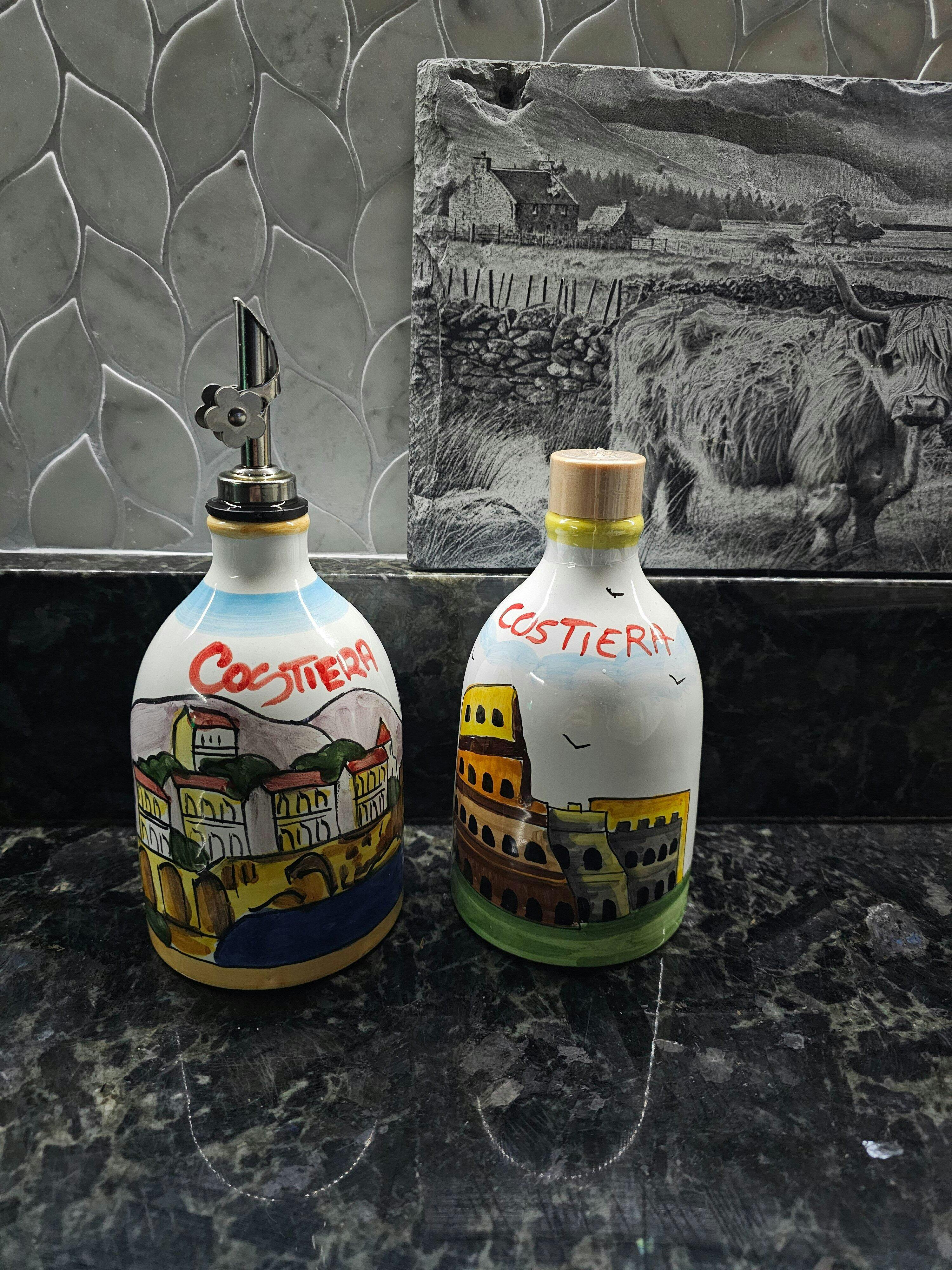 Premium Costiera Extra Virgin Olive Oil made purely from a single variety of olive called "Peranzana" (Monocultivar). These olives have been squeezed in our Oil Mill in Montesarchio (BN, Campania Region), Italy. 100% Product of Italy. First Cold Pressed. Gluten Free Food. This ceramic bottle has been hand made by our crafters on the Amalfi Coast of Italy. All of our EVOO is Gluten Free.