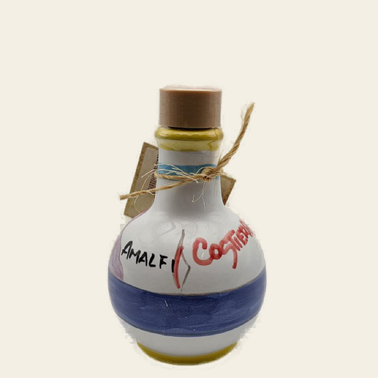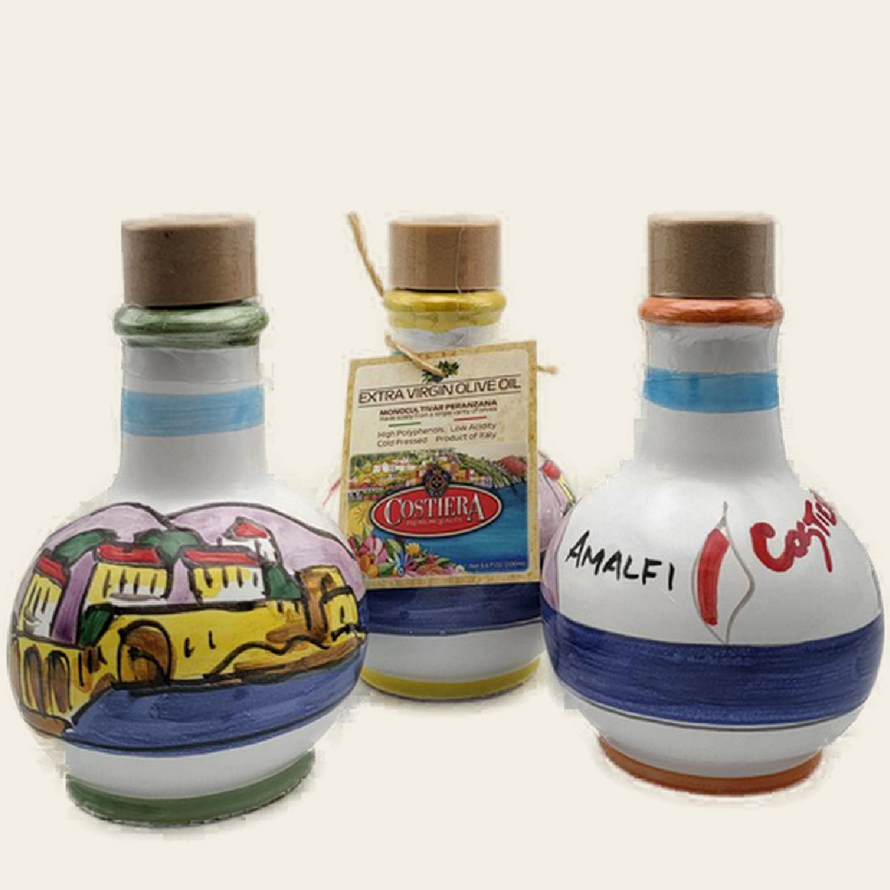 Premium Costiera Extra Virgin Olive Oil made purely from a single variety of olive called "Peranzana" (Monocultivar). These olives have been squeezed in our Oil Mill in Montesarchio (BN, Campania Region), Italy. 100% Product of Italy. First Cold Pressed. Gluten Free Food. This ceramic bottle has been hand made by our crafters on the Amalfi Coast of Italy. All of our EVOO is Gluten Free.