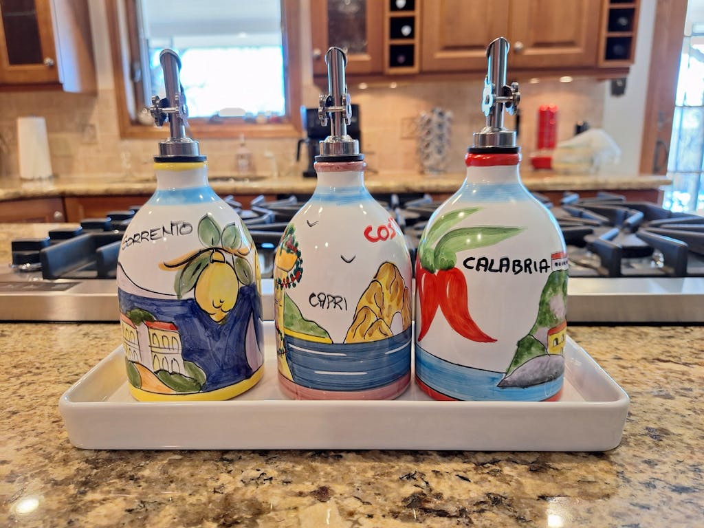 Premium Costiera Extra Virgin Olive Oil made purely from a single variety of olive called "Peranzana" (Monocultivar). These olives have been squeezed in our Oil Mill in Montesarchio (BN, Campania Region), Italy. 100% Product of Italy. First Cold Pressed. Gluten Free Food. This ceramic bottle has been hand made by our crafters on the Amalfi Coast of Italy.