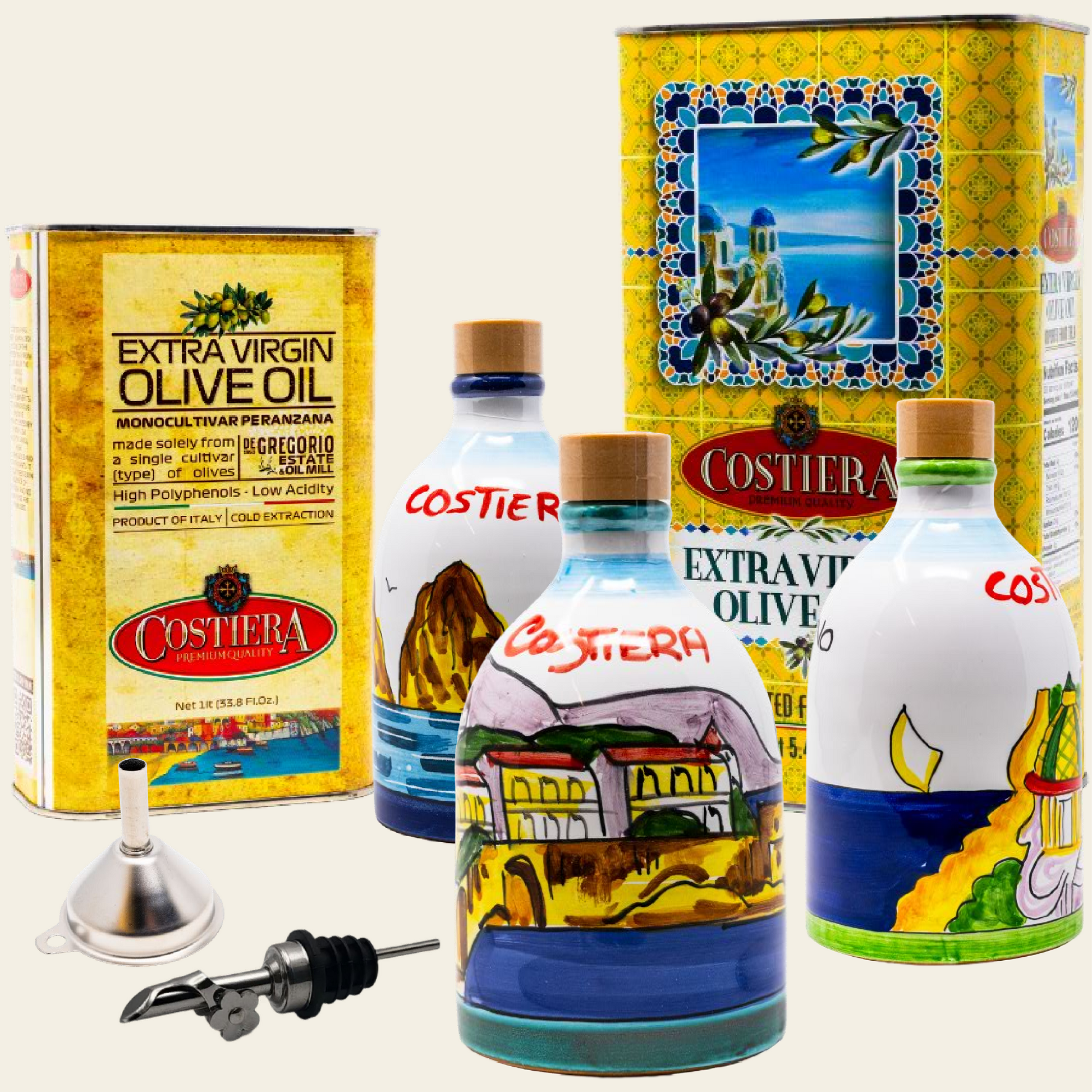 Costiera Combo with a Tin, a Spout, a FREE Funnel and a 250ml Extra Virgin olive Oil Ceramic Bottle of Your Choice. From $90
